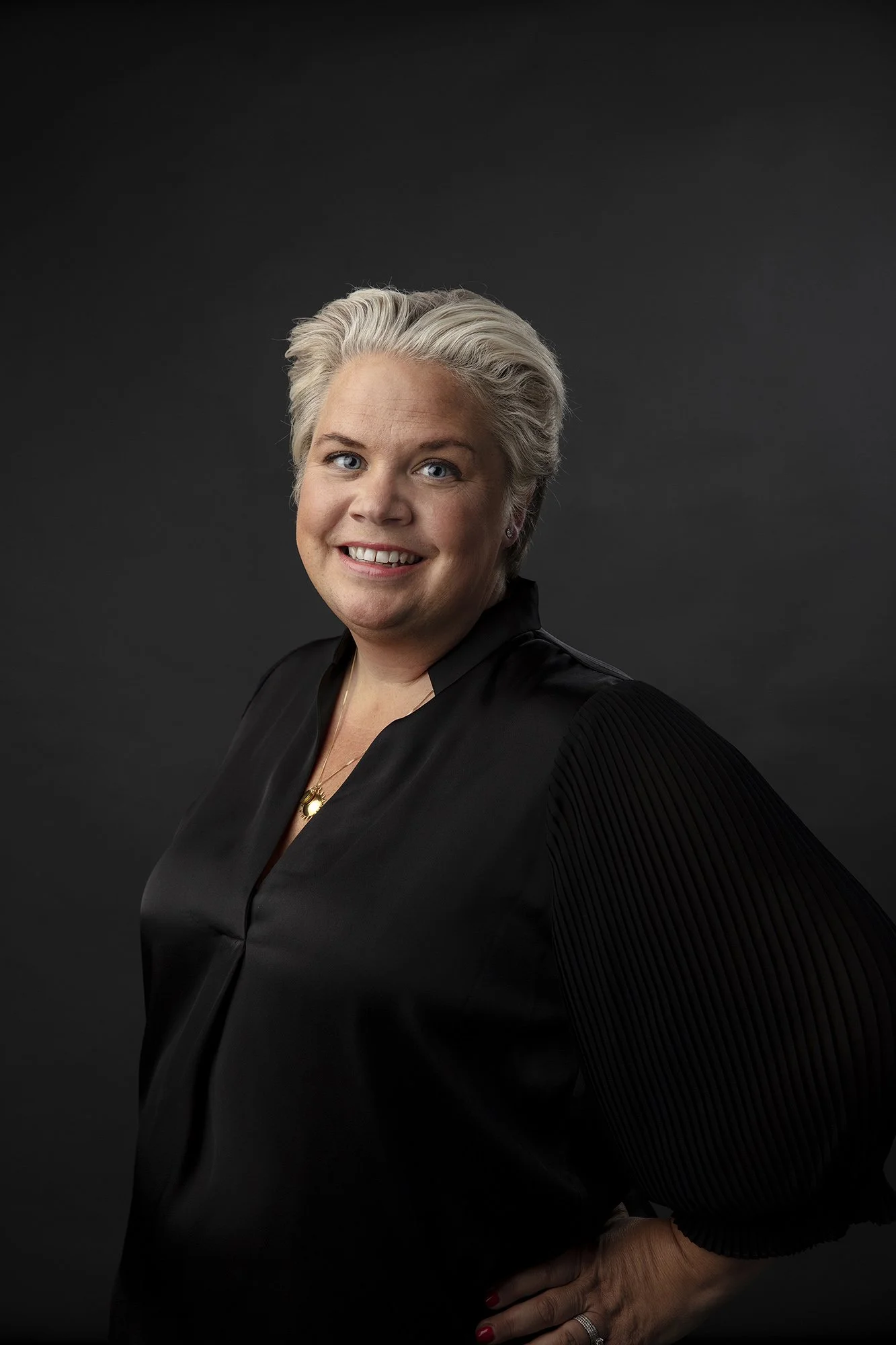 Personalporträtt mot vit bakgrund där ljuset faller av och skapar ljusgrå bakgrund.
